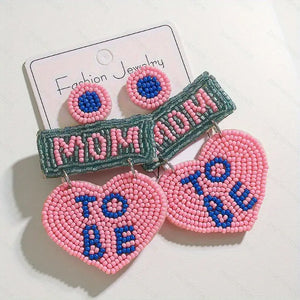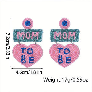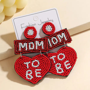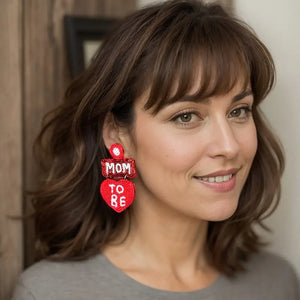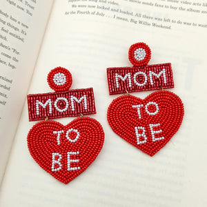 - DESIGN: Beautiful handcrafted heart-shaped earrings featuring "MOM TO BE" text in white beadwork on a vibrant red background