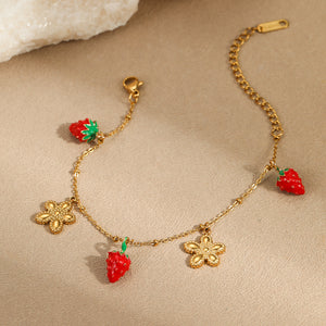 Add a touch of sweetness to your style with this adorable 18K gold plated stainless steel bracelet featuring cute strawberry and flower charms. Perfect for women and girls who love charming, trendy accessories.