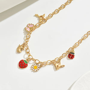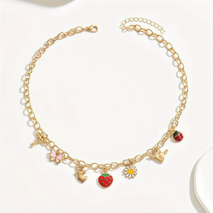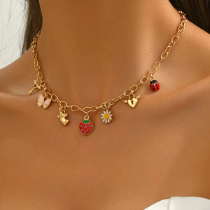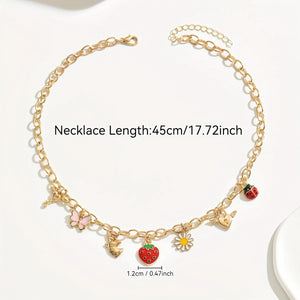 Add a playful touch to your style with this charming necklace featuring delightful strawberry, butterfly, unicorn, and heart pendants. Crafted from high-quality 18K gold-plated zinc alloy, it's perfect for any occasion.