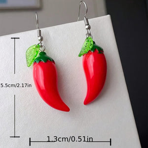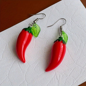 Chic Red Chili & Green Leaf Dangle Earrings-Resin