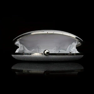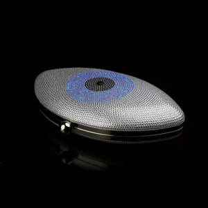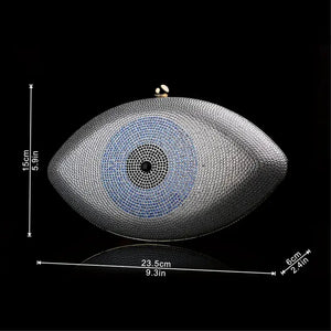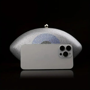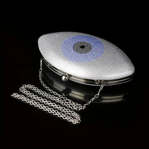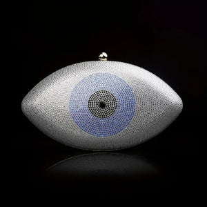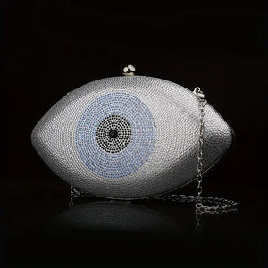Add a touch of European glamour with this gorgeous glittering rhinestone clutch. Featuring a double-sided evil eye pattern and oval hard shell design, this clutch combines style and sophistication with a removable strap.