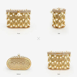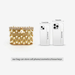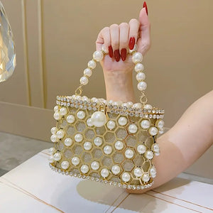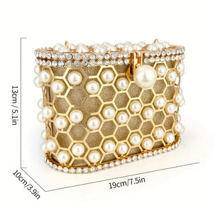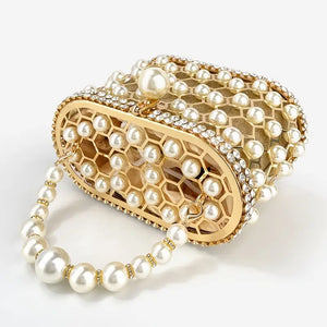 Exude elegance with this unique hollowed-out metal mesh bag featuring rhinestones and vintage charm. Perfect for a sophisticated evening look, this pearl-accented bird cage bag adds a touch of luxury.
