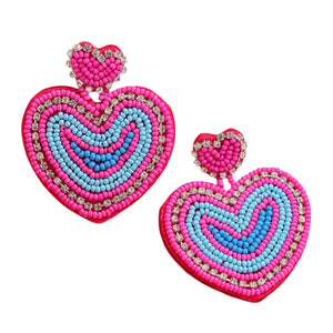 - DESIGN: Stunning double heart-shaped drop earrings featuring intricate beadwork in vibrant pink and turquoise blue with sparkling rhinestone accents