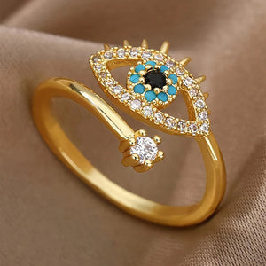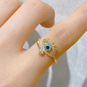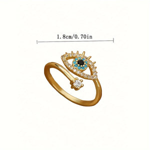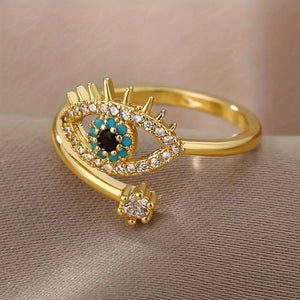 Evil Eye ring with gold-toned copper finish, featuring turquoise stones and sparkling crystal accents. Adjustable design and mystical motif perfect for adding a unique touch to your jewellery collection.