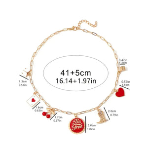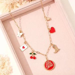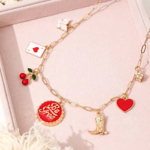 • CHARMING DESIGN: Delicate gold-tone chain necklace featuring playful charms including a red heart, playing card, cherry motif, and decorative boot pendant