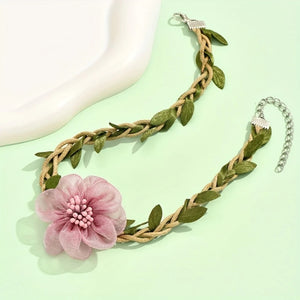 Elevate your style with this enchanting choker necklace, blending rustic charm with delicate beauty. Features a lovely pink fabric flower and natural braided jute cord with lifelike green leaves, finished with an adjustable silver-tone chain.