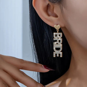 - DESIGN: Stunning gold-tone BRIDE dangle earrings featuring heart studs and crystal rhinestone-encrusted letter design for elegant bridal wear