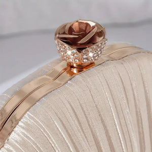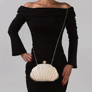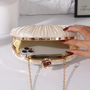 Add a touch of ocean-inspired glamour with this elegant champagne shell-shaped clutch. Perfect as a crossbody bag for women, it's ideal for evening events and special occasions.