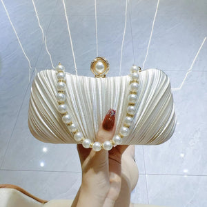 Elegant Women Pleated Satin Handbags with Pearl Handle