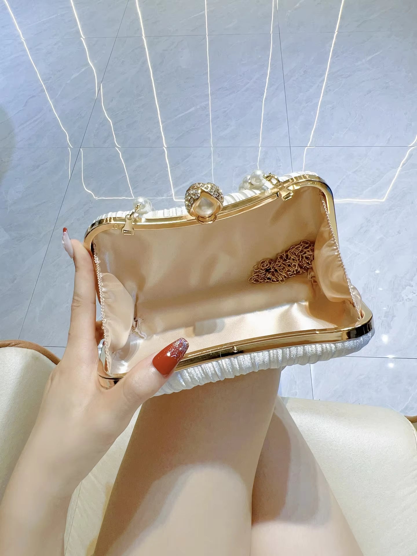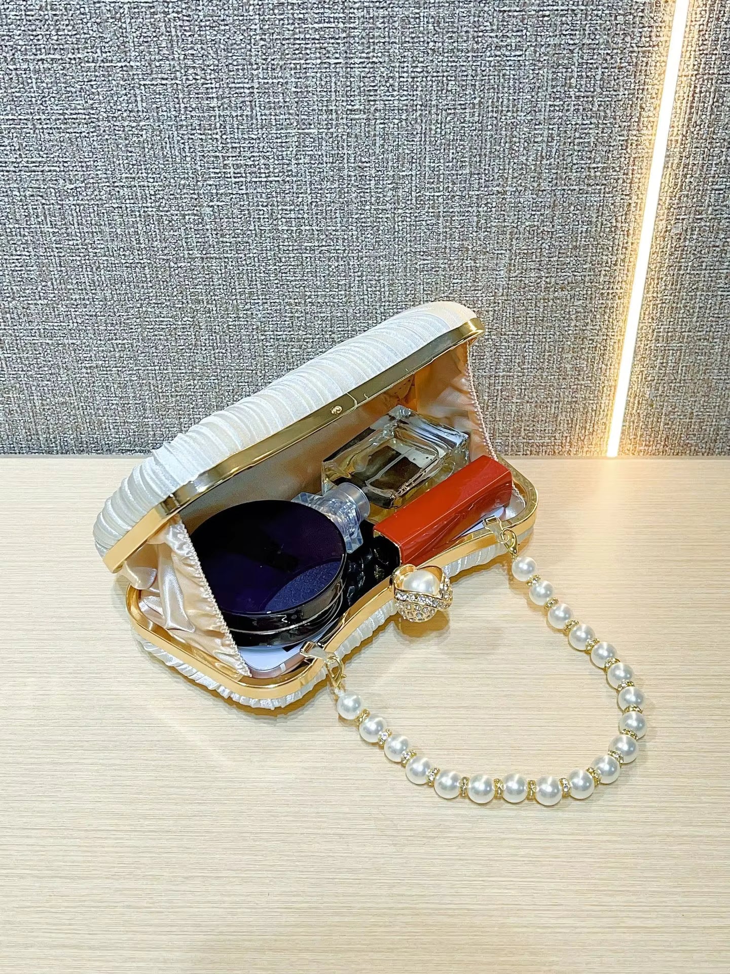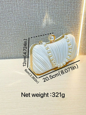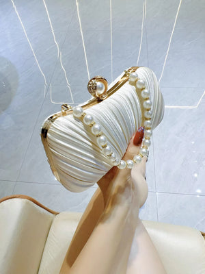 Elevate your evening look with this stunning white satin pleated clutch bag, featuring a luxurious pearl handle and elegant gold accents.