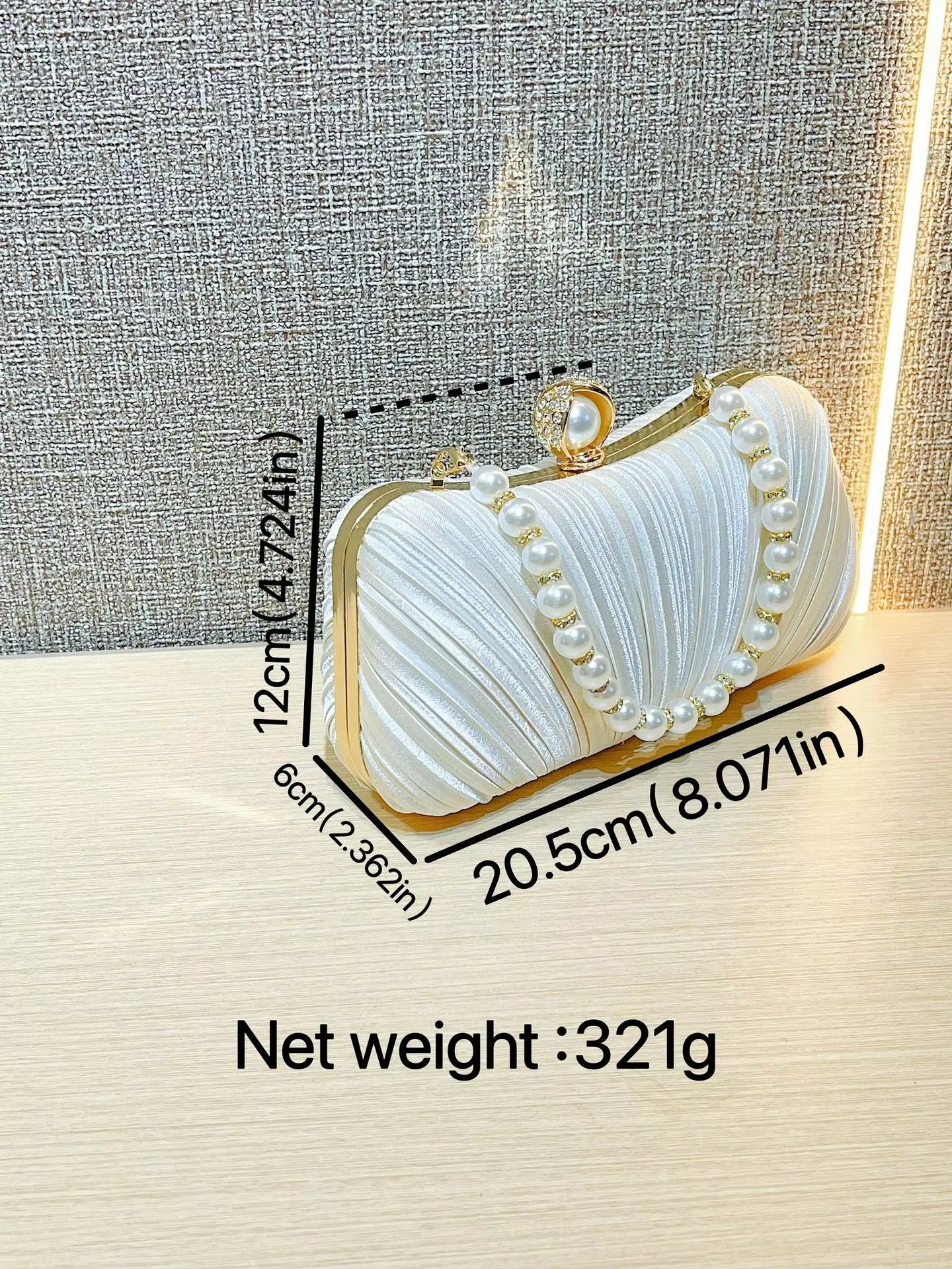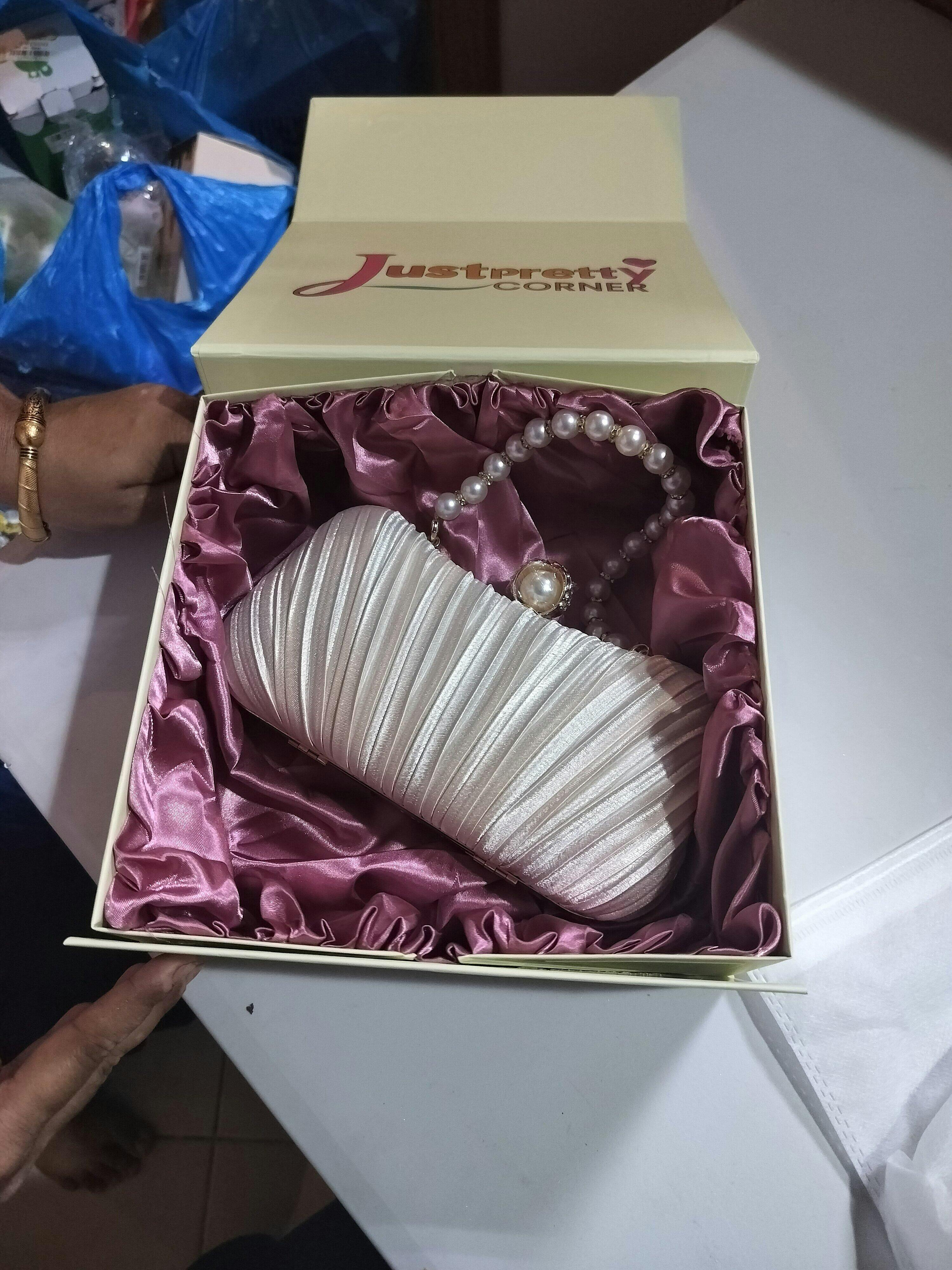 Elevate your evening look with this stunning white satin pleated clutch bag, featuring a luxurious pearl handle and elegant gold accents. Key Features: Luxurious Satin Material: Soft and smooth to the...