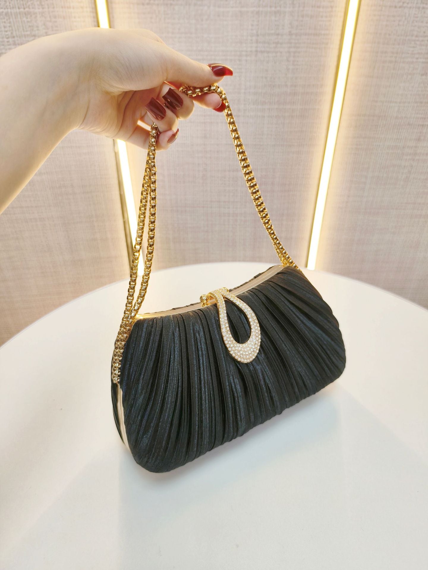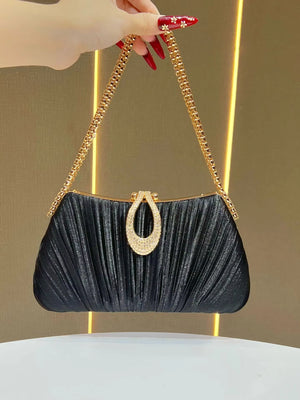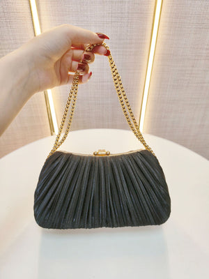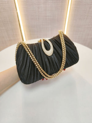Elevate your evening style with this stunning black clutch bag, featuring a luxurious pleated design and elegant gold accents. The bag's design features a pleated, fan-like pattern and a gold clasp in the shape of a teardrop, adding a touch of sophistication. The gold chain strap is attached to the top of the bag, allowing it to be worn over the shoulder or in hand.