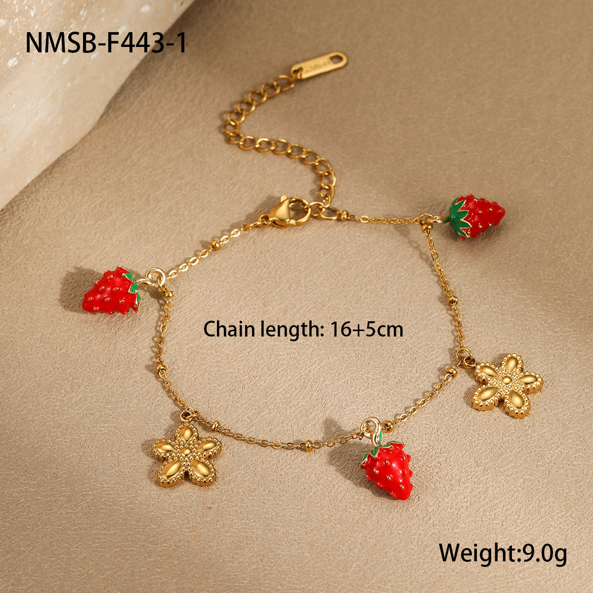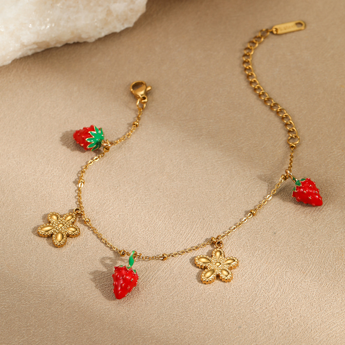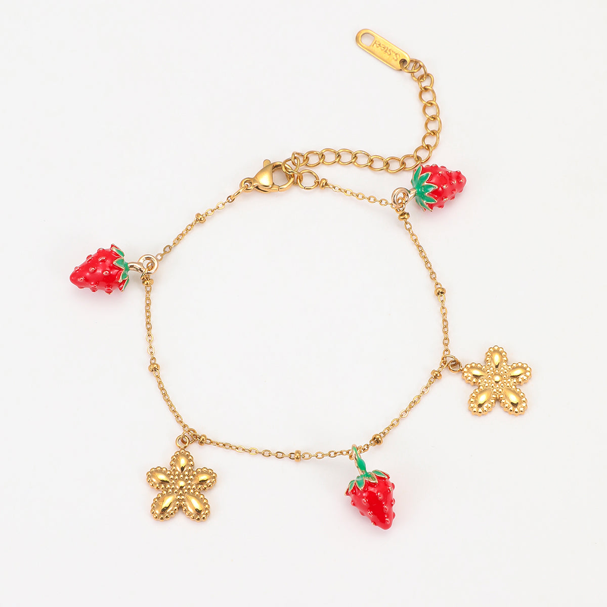 Add a touch of sweetness to your style with this adorable 18K gold plated stainless steel bracelet featuring cute strawberry and flower charms. Perfect for women and girls who love charming, trendy accessories.
