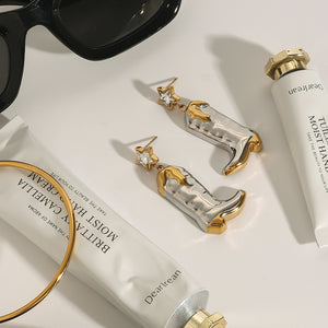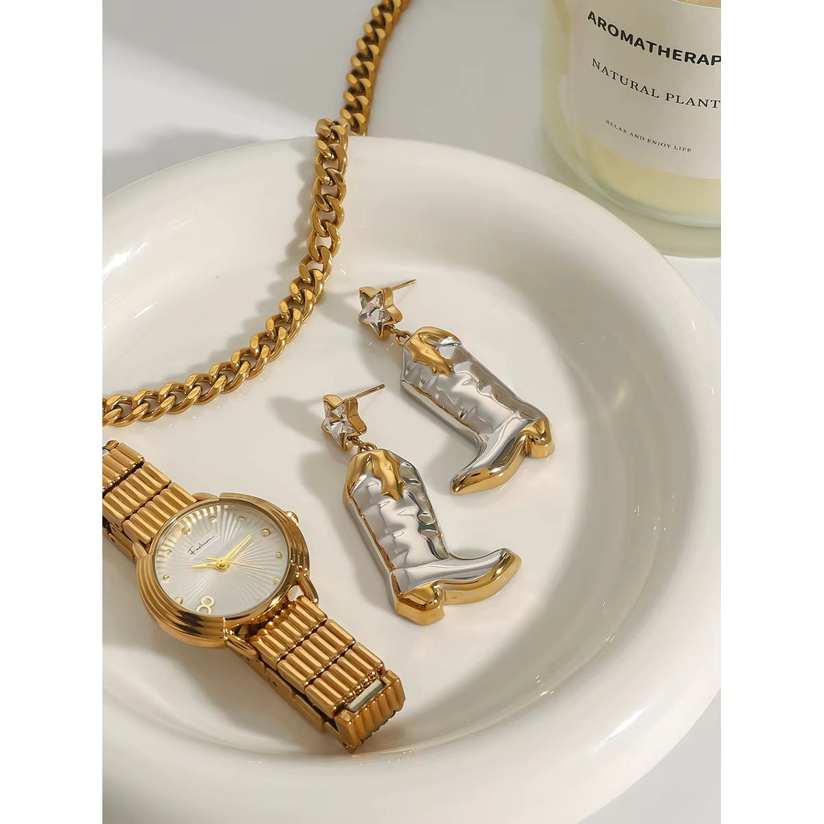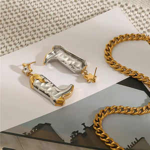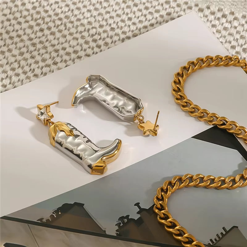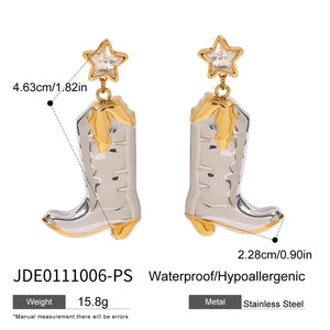 Add a touch of country charm to your style with these 18K gold PVD plated stainless steel earrings featuring a two-tone star design and cowboy boot shape.