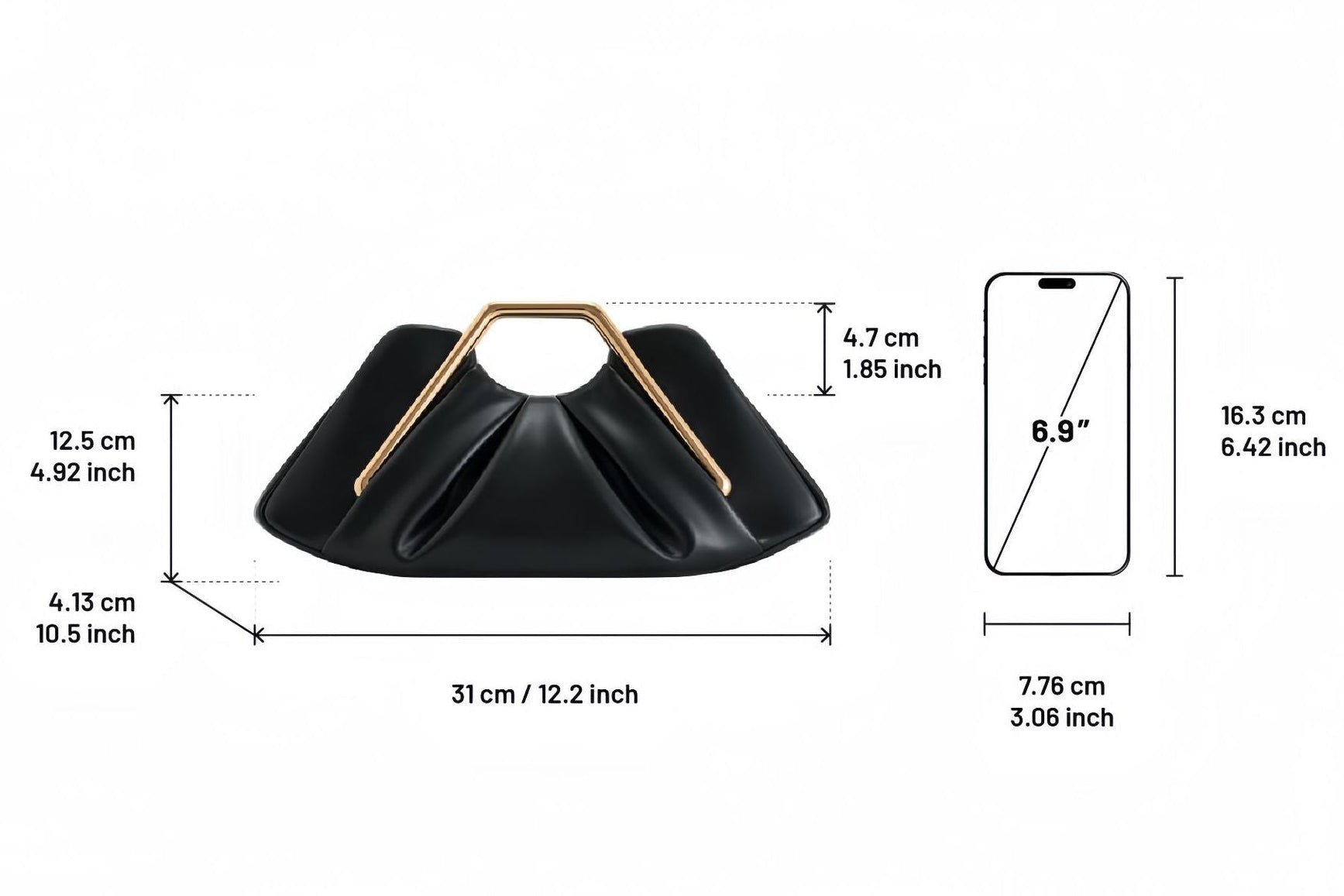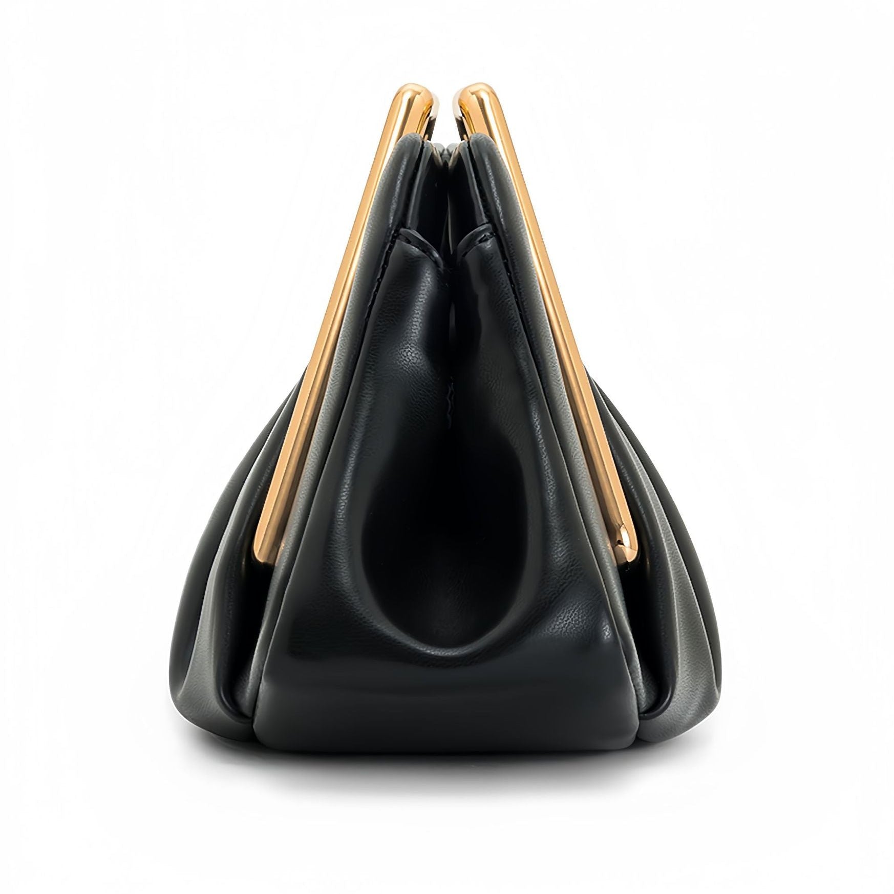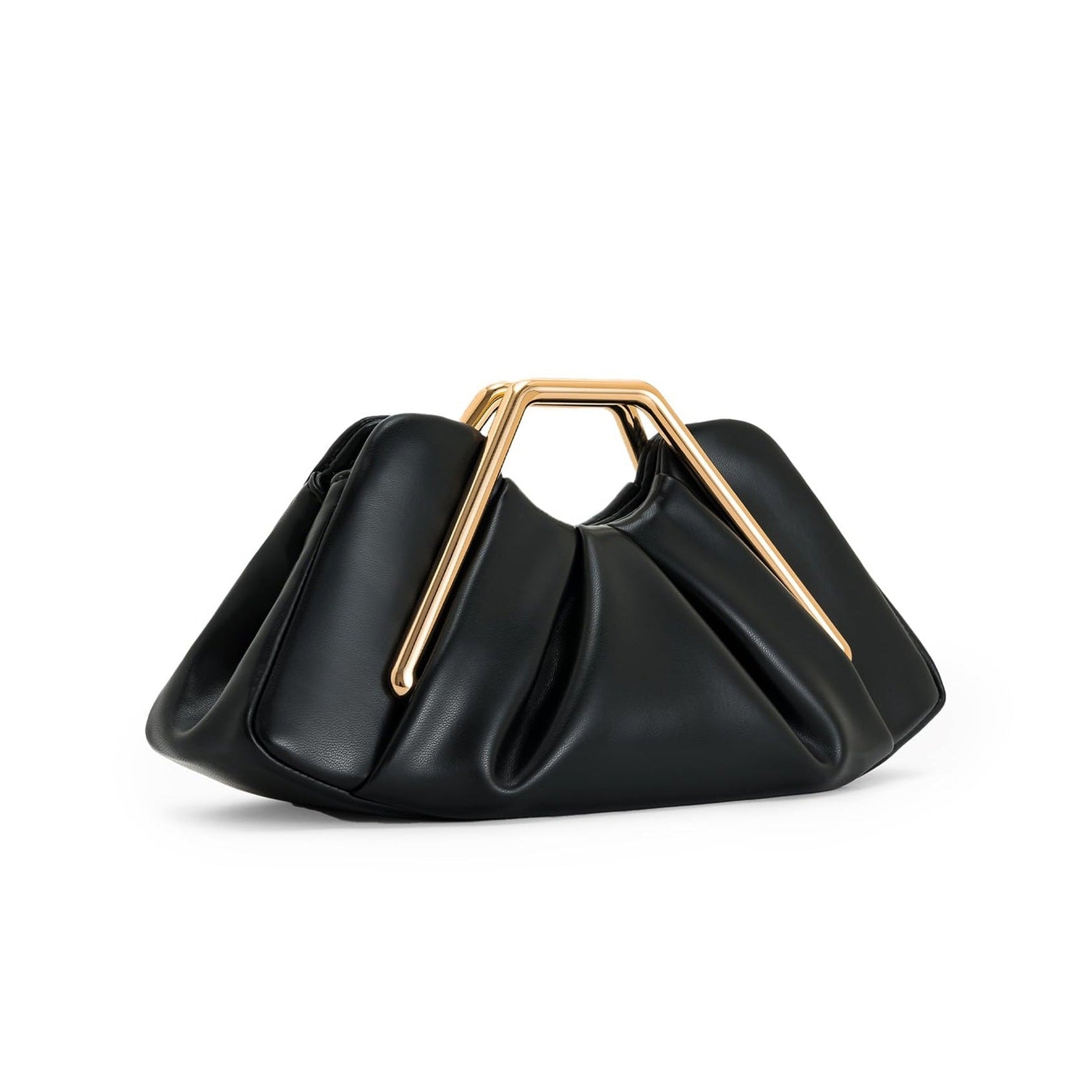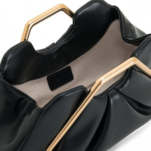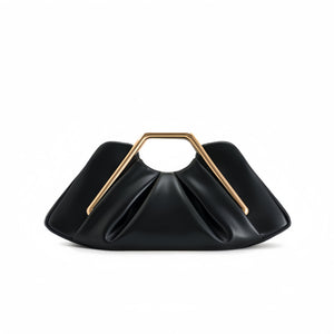 Elevate your evening look with this modern design evening clutch. Featuring a sophisticated pleated silhouette and a bold geometric gold-tone handle, this bag seamlessly blends avant-garde style with timeless elegance.